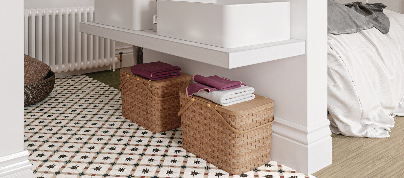 Zemitá farebnosť v kombinácii s malými keramickými obkladmi nehrá na efekt, ale cielene buduje pokojnú, hrejivú náladu priestoru.